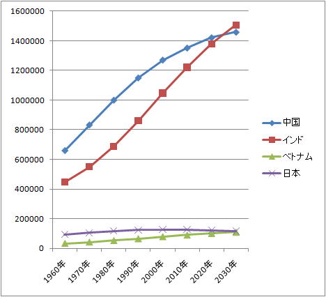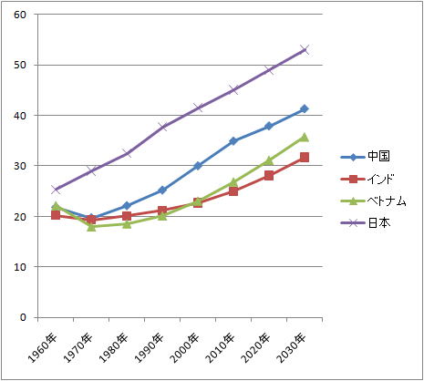 その中国も20年先には人口数でインドに抜かれます。これから高齢化も進む中、1人あたりのGDPをあげていく方向で成長を目指していくでしょう。社会階層が分化していく中で、どれだけの中間層を形成できるかが課題です。