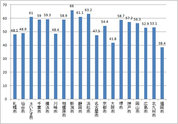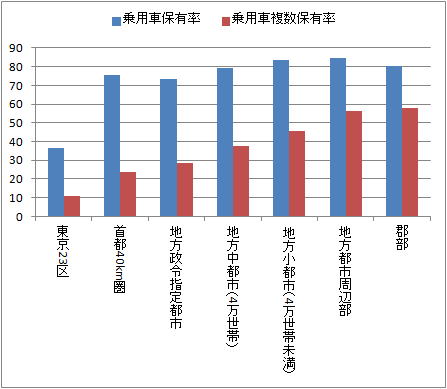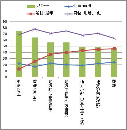 図ー代表交通手段分担率(パーソントリップ調査)〜東京都市圏2008年、京阪神2010年