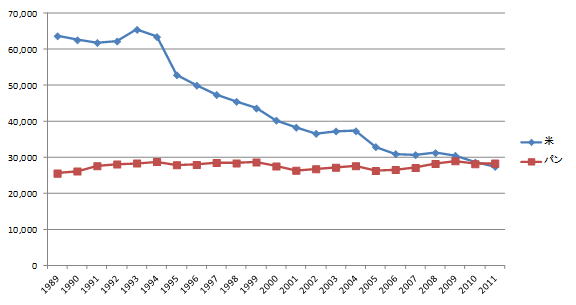 ホテル単体での売上規模が100億円を超えるホテルが2010年の32ホテルから16ホテルへと半減してます。東日本大震災、東京電力原発事故が大きなダメージになっています。訪日観光客数も月から夏頃までは大きくダウンしていました。さらに欧州の経済危機に発する円高が追い打ちをかけます。