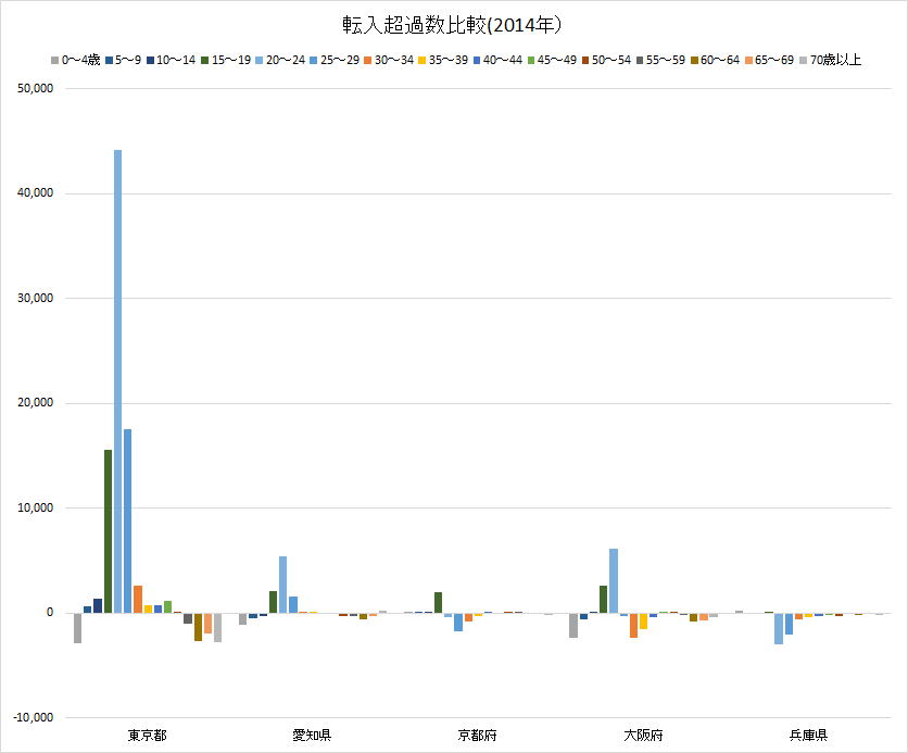 転入者数から転出者数を引いた転入超過数を比較すると、その都市の特徴が明らかになります。15~19歳の大学入学時の転入超過数が多いのが,東京都の他、京都府、大阪府、愛知県です。